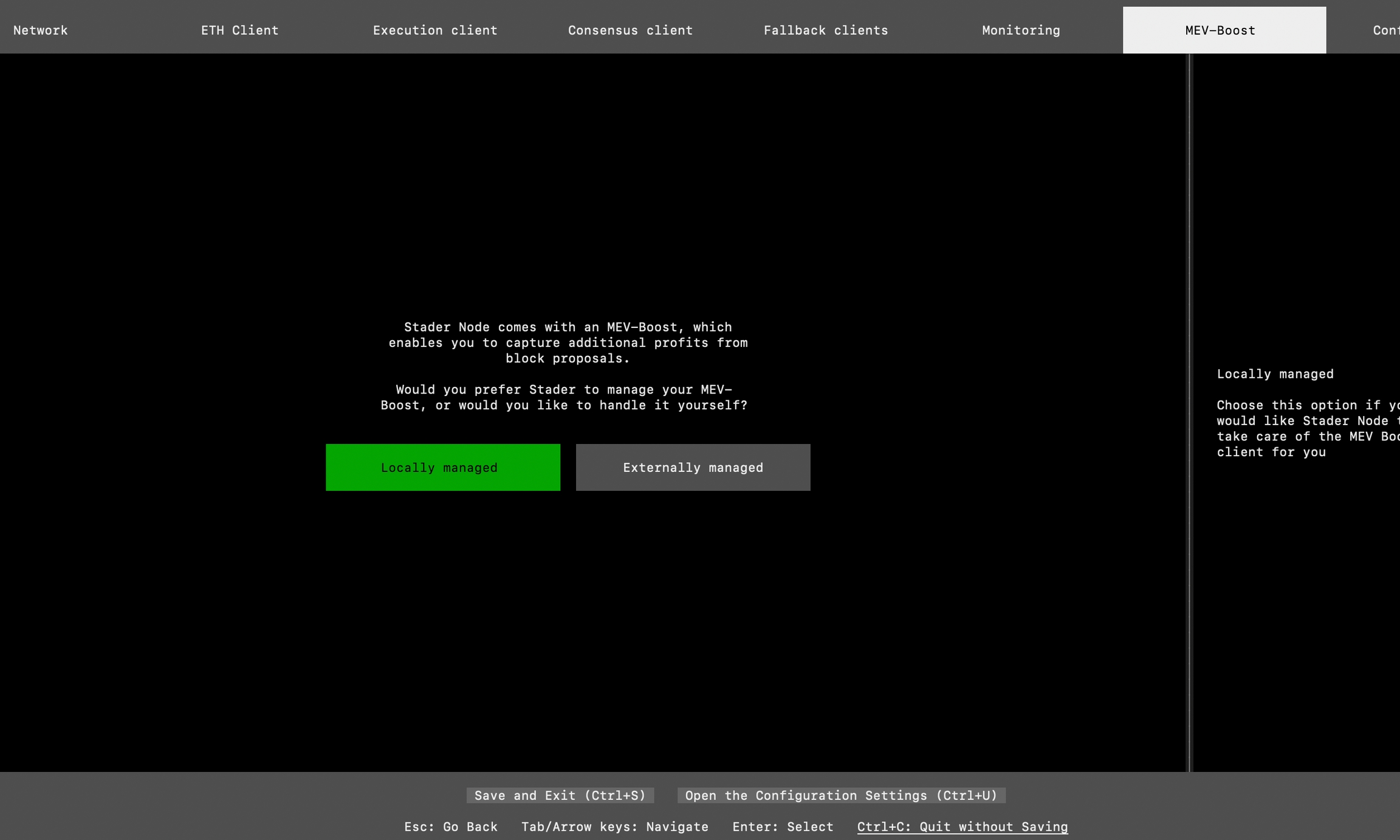 Locally managed: Choose this option if you would like Stader Node to take care of the MEV Boost client for you