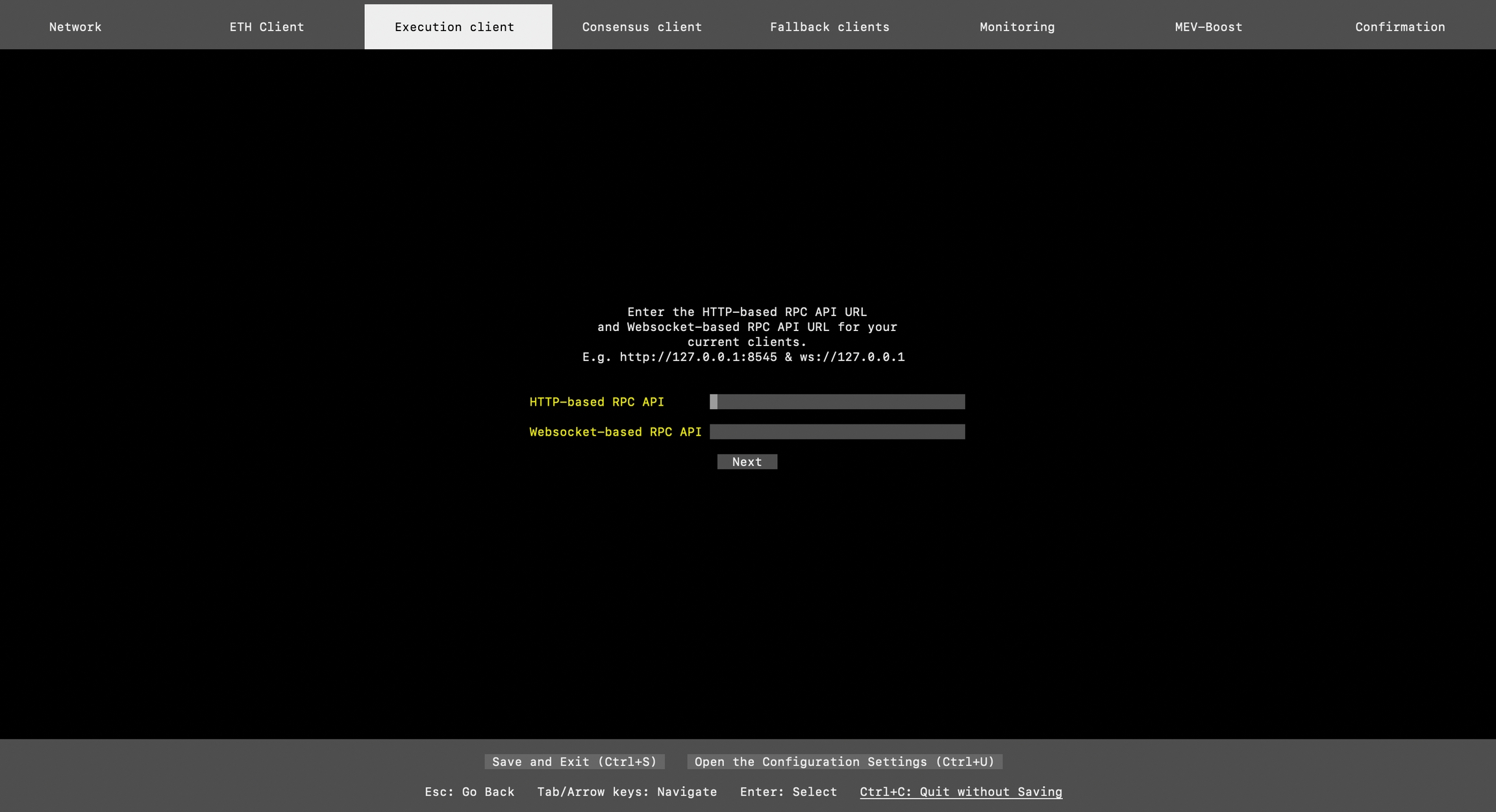 If you have chosen the "Externally Managed" option during the ETH client configuration step, then just enter the HTTP-based RPC API URL and Websocket-based RPC API URL for your current Execution client.