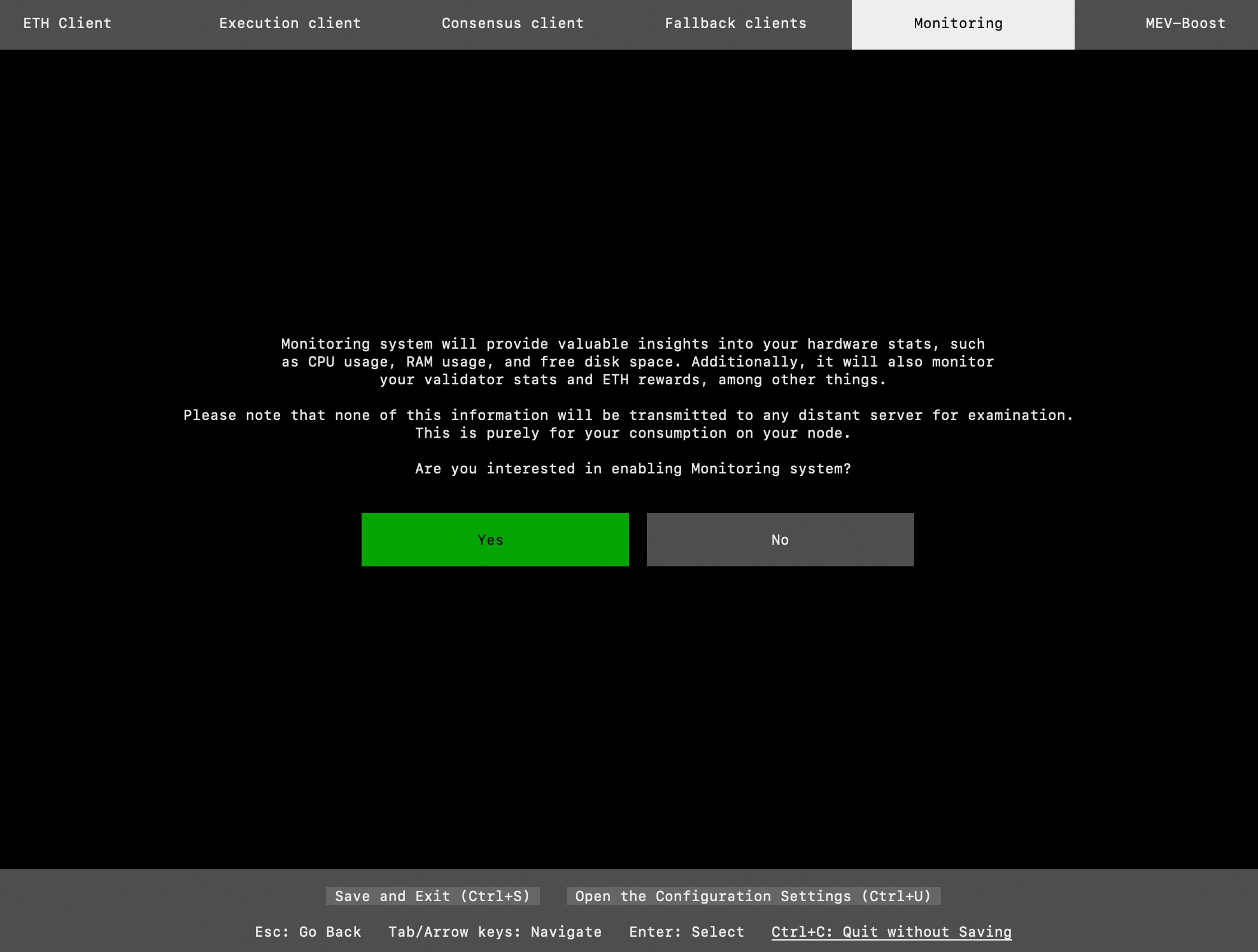 Enabling monitoring will offer valuable insights into your hardware statistics, including CPU usage, RAM usage, and available disk space. Additionally, it will monitor your validator statistics and ETH rewards, among other relevant information. It's important to note that none of this data will be transmitted to any remote server for analysis; it is solely intended for your own observation on your node. If you wish to enable the monitoring system, please select "Yes".