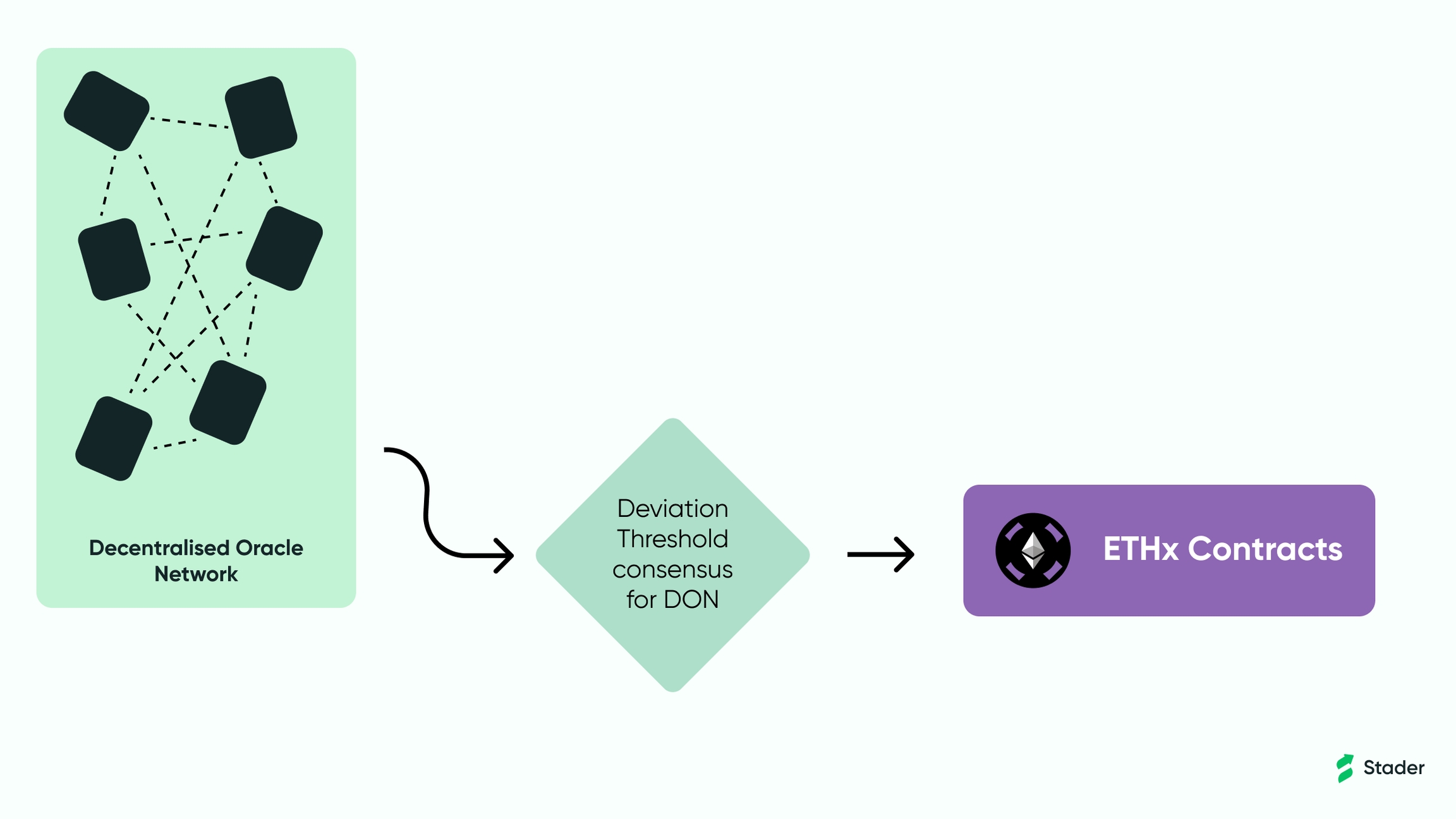 a. Amount of ETHx tokens in circulation b. Amount of ETH tokens that are staked or in the process of being staked. c. Ensuring that the above two conditions are reported for the same block number. The exchange rate of ETHx to ETH is defined as the total ETHx supply divided by the total ETH that is staked + in the process of being staked at any point. Stader Oracle contract sets the frequency of updating the exchange rate data. The Oracle client operators report the exchange rate through the majority consensus mechanism for appropriate blocks. Between Oracle consensus updates, the exchange rate is constant and assumed to be non-changing. An exchange rate update that meets the consensus threshold is accepted if it’s within a specific range of the old exchange rate. Inspection mode is enabled when the new exchange rate deviates significantly from the old one. In inspection mode, the Stader manager is expected to verify the validity of the new exchange rate. Anyone can also turn off the inspection mode after the verification period for the inspection mode ends. The latter ensures that anyone can continue exchange rate updates except during short bursts for verification purposes. Stader has partnered with Chainlink to provide Proof of Reserve data feeds for both ETHx and ETH supply to act as an alternative to the above. In the subsequent protocol upgrades, we expect to integrate and transition to Chainlink’s Decentralized Oracle Network (DON).